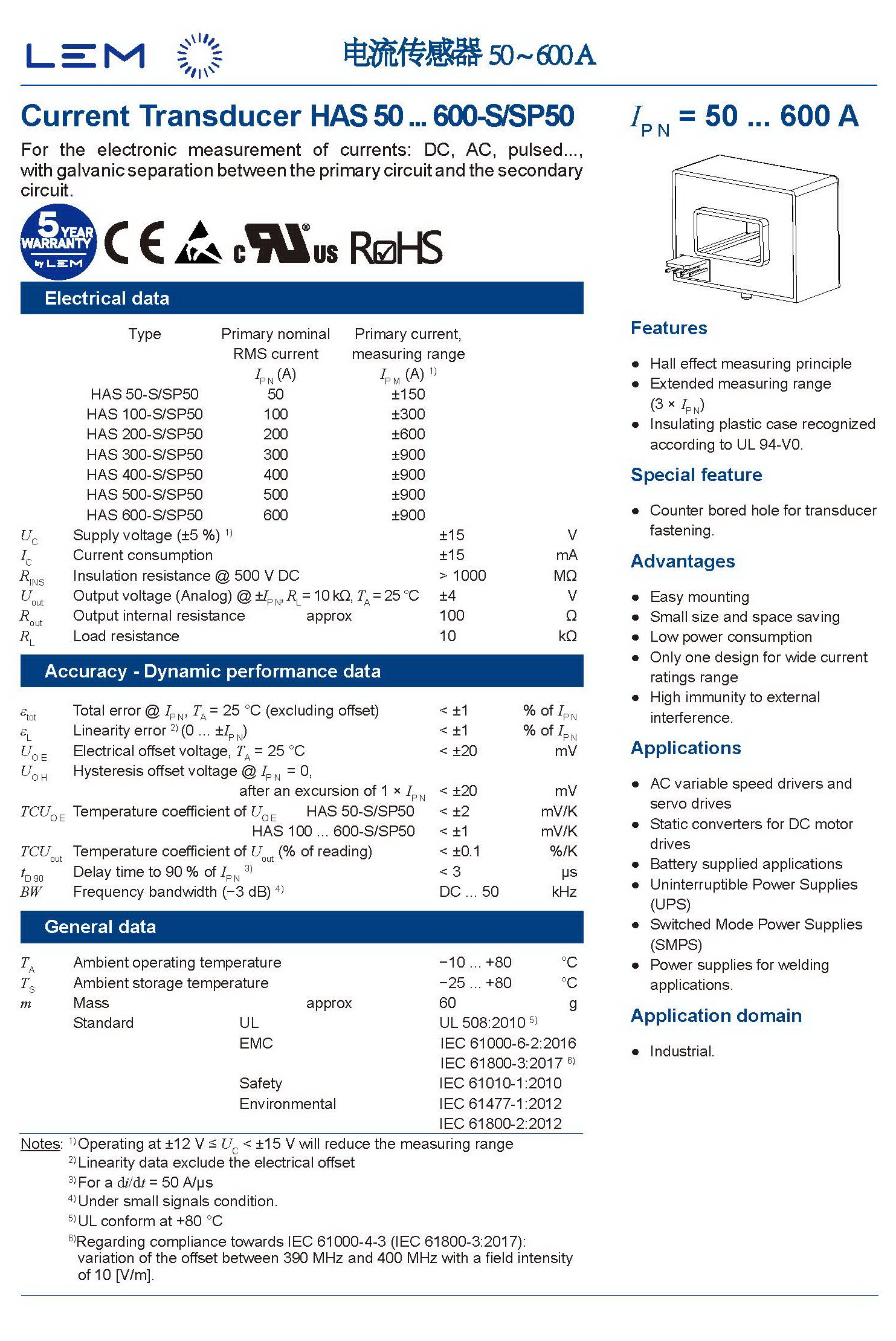 HAS 200-S/SP50 Ipn=200A Ipm=±600A
